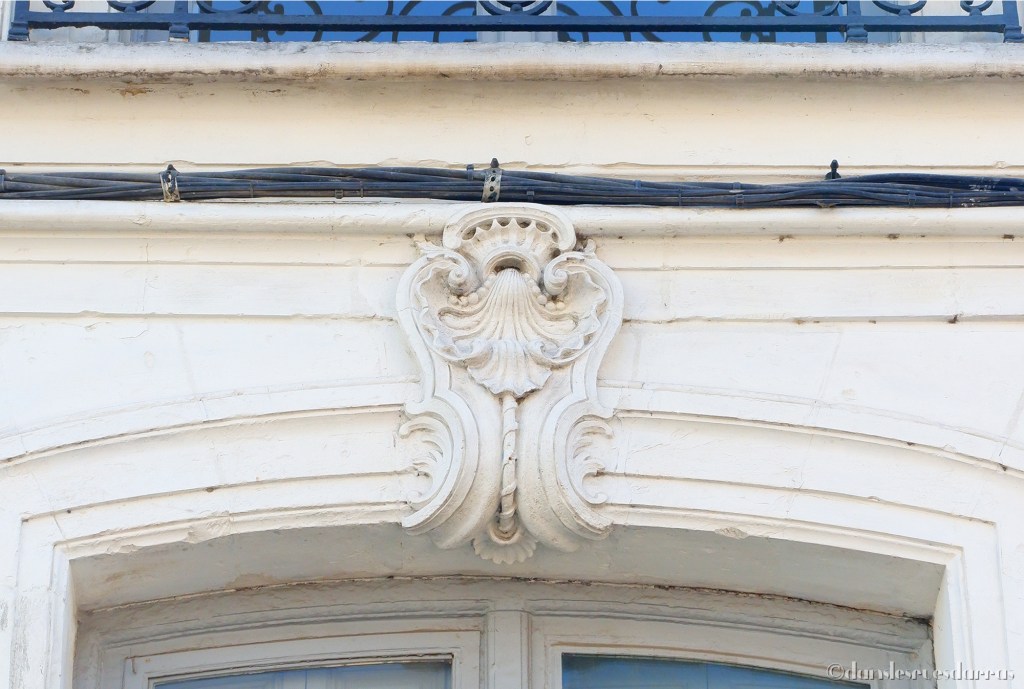 – Il est agrémenté de gardes-corps en fer forgé et de coquilles sur les clefs des linteaux de fenêtres. Ces décors sont typiques des styles Régence (1700-1730) et Rocaille (1730-1745) sous les règnes des Louis XIV-XV-XVI (détails des clefs d’arcs ci-dessus).